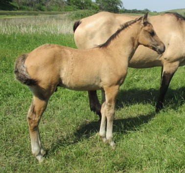 This is a pretty headed fancy dun colt that is homozygous black (EE). This colt is a full brother to a money earner in Ranch Horse & Heeling. He is also a full brother to a colt that is in Germany now & will be shown. This colt is well balanced straight legged & real athletic. He will be another outstanding performance prospect. If you are looking for a top notch rope horse prospect you need to check out this colt. His dam's sire Ermosa Gallo has 459 AQHA roping pts & has been to the World many times so he also has money earning. Bobby Lewis showed Hollywood Heat in roping & he has 345 AQHA pts. This colt already knows how to stop hard & he is bred to be an all around performer.